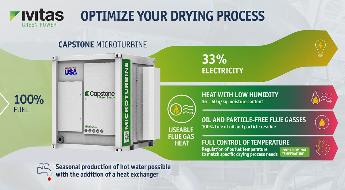 Szukasz sposobu na usprawnienie procesów suszenia przemysłowego? Właśnie go znalazłeś! Specjaliści z IVITAS GREEN POWER zaproponują rozwiązanie wykorzystujące mikroturbiny Capstone, które zapewnią niezbędne czyste i suche powietrze do suszenia procesowego wraz z ciepłem i energią dla Twoich zakładów!